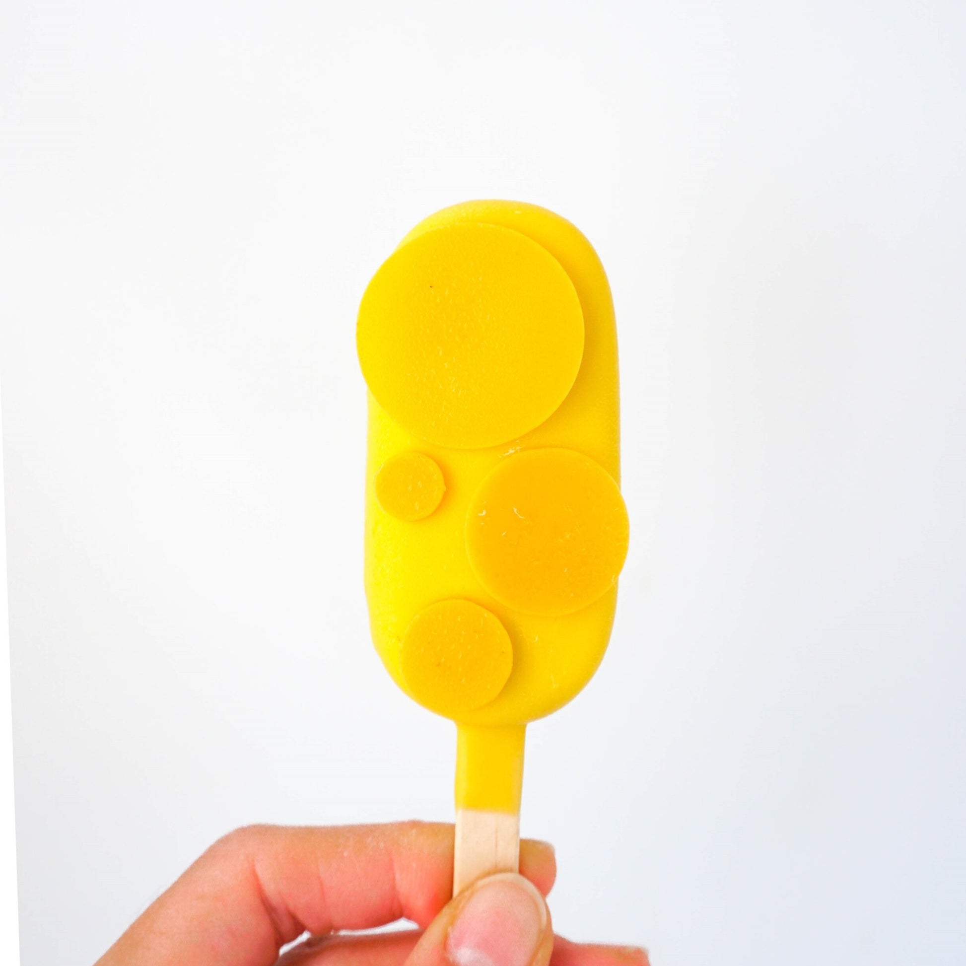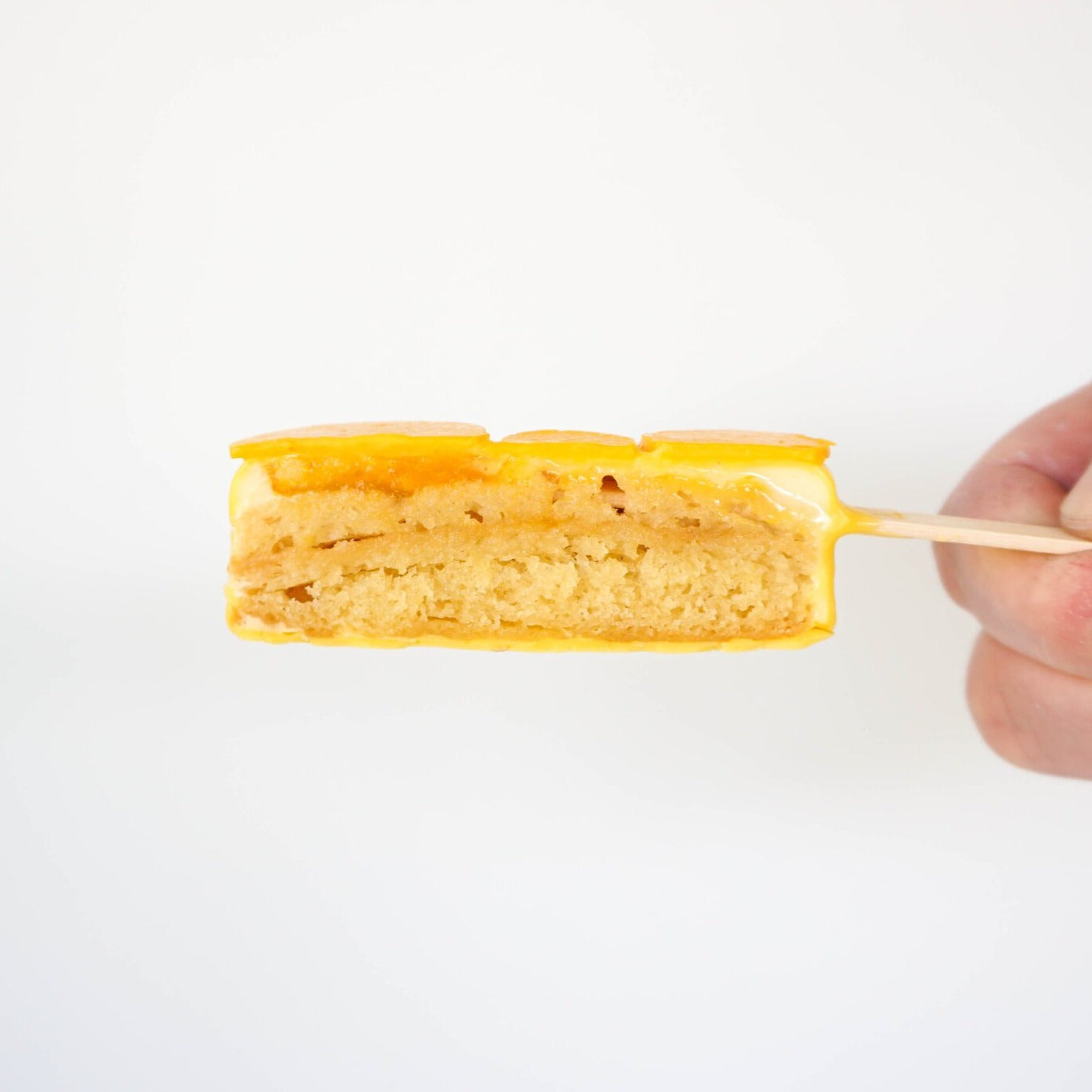 Tropical - Vanilla sponge. mango jam. passionfruit cream. coated with Callebaut 28% white chocolate, ganished with yellow chocolate disc.